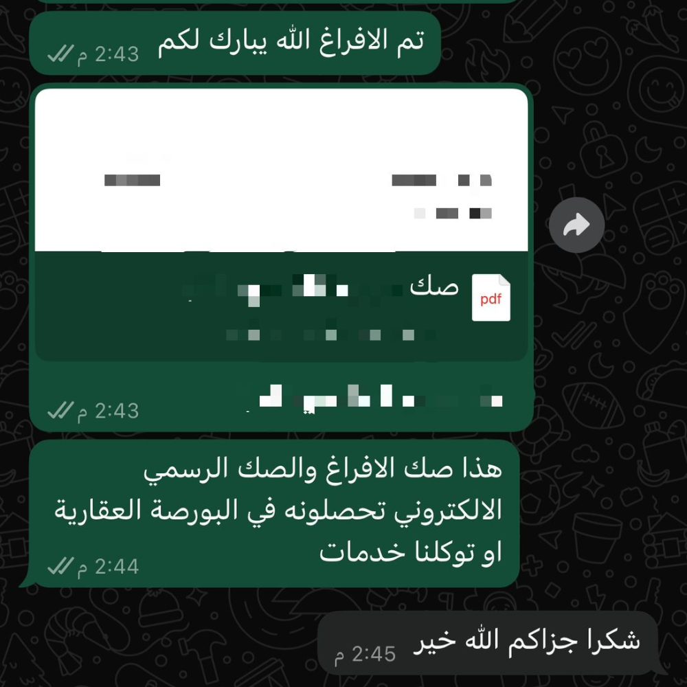 نقوم بإتمام المعاملة وتسليمك الخدمة بشكل نظامي كامل، مع متابعة حتى صدور الصك أو التوثيق النهائي.